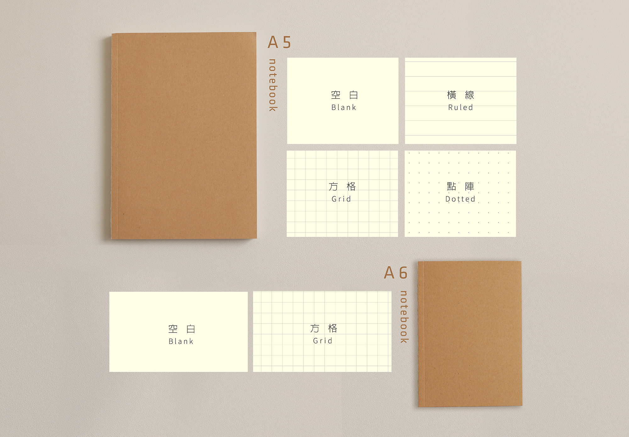 A 5 內 頁 共 有 四 種 款 式,A 6 內 頁 有 兩 種 款 式,可 依 需 求 另 外 加 購 不 同 的 書 本 內 頁。
