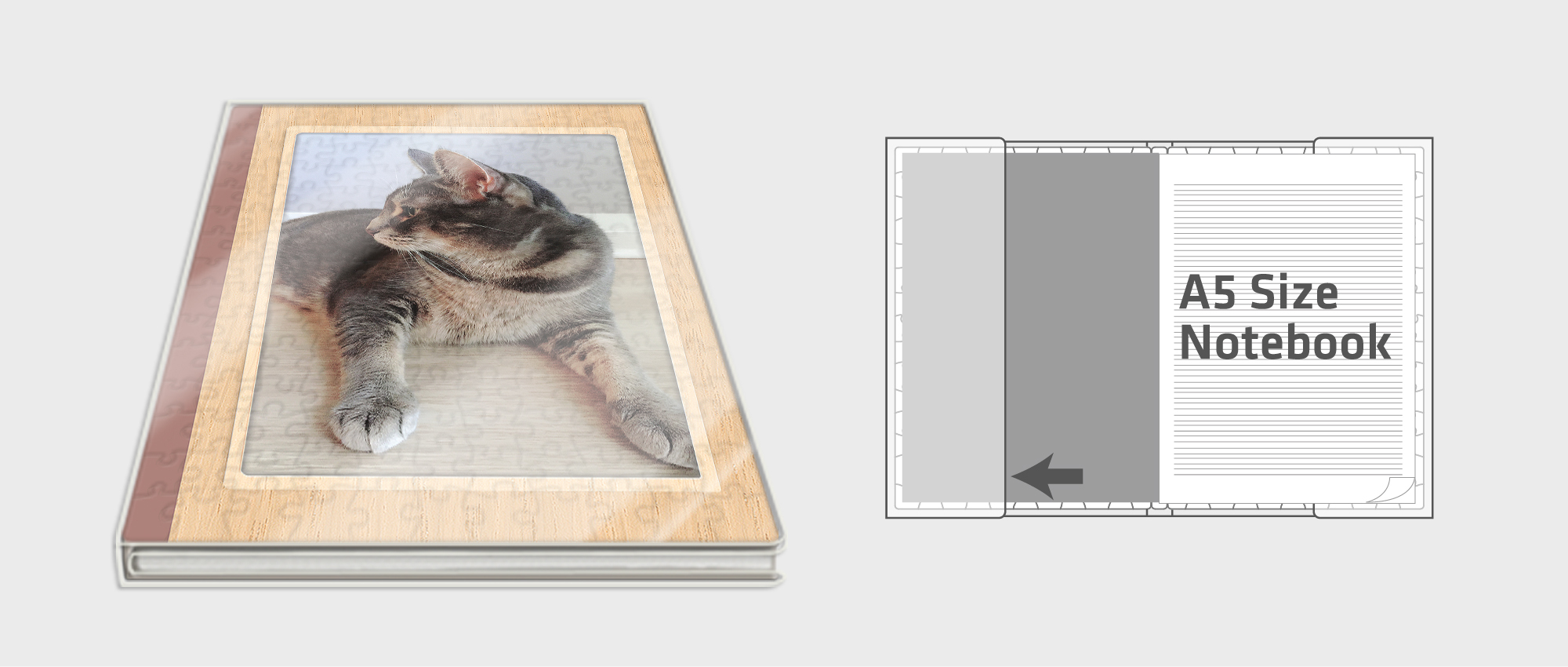 客 製 化 書 衣 拼 圖 , 含 A5 筆 記 本 內 頁 + 透 明 保 護 書 套 。