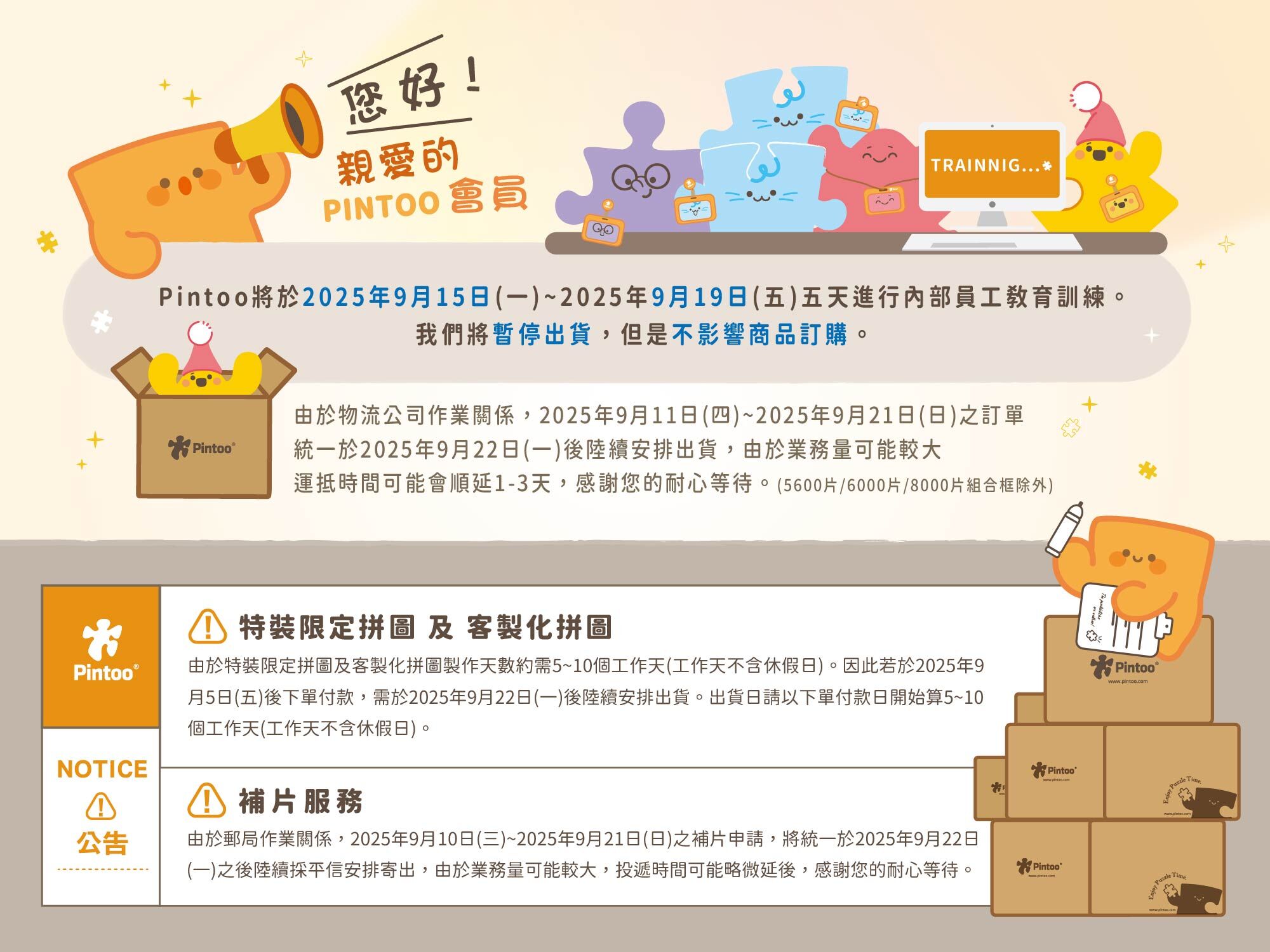 P i n t o o 將 於 2 0 2 5 年 9 月 1 5 日 ( 一 ) ~ 2 0 2 5 年 9 月 1 9 日 ( 五 ) 五 天 進 行 內 部 員 工 教 育 訓 練 。