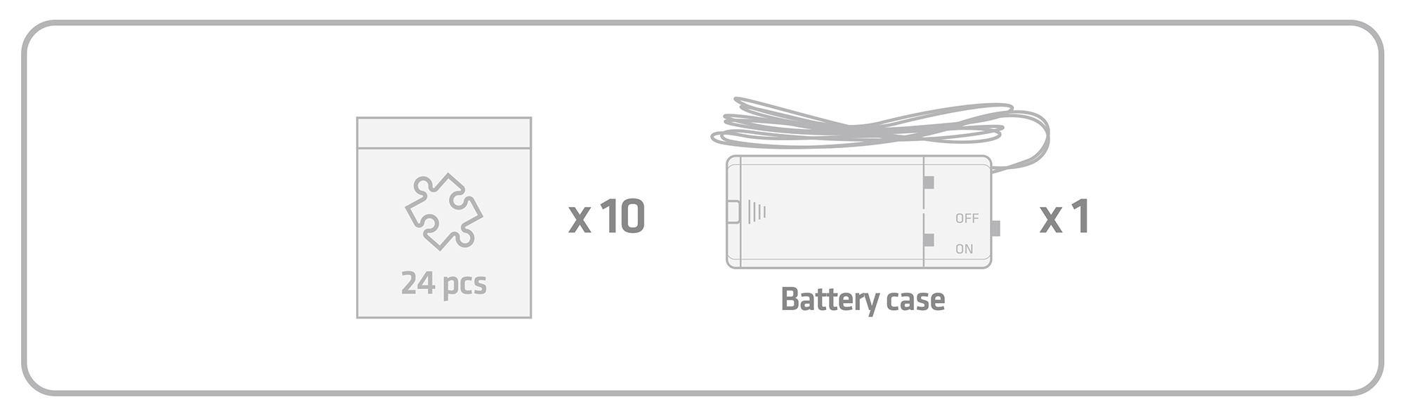 共 有 10 包 拼 片 包 和 一 個 LED 燈 串 電 池 盒 ( 本 產 品 使 用 2顆 AA 三 號 電 池 , 需 自 行 購 買 )