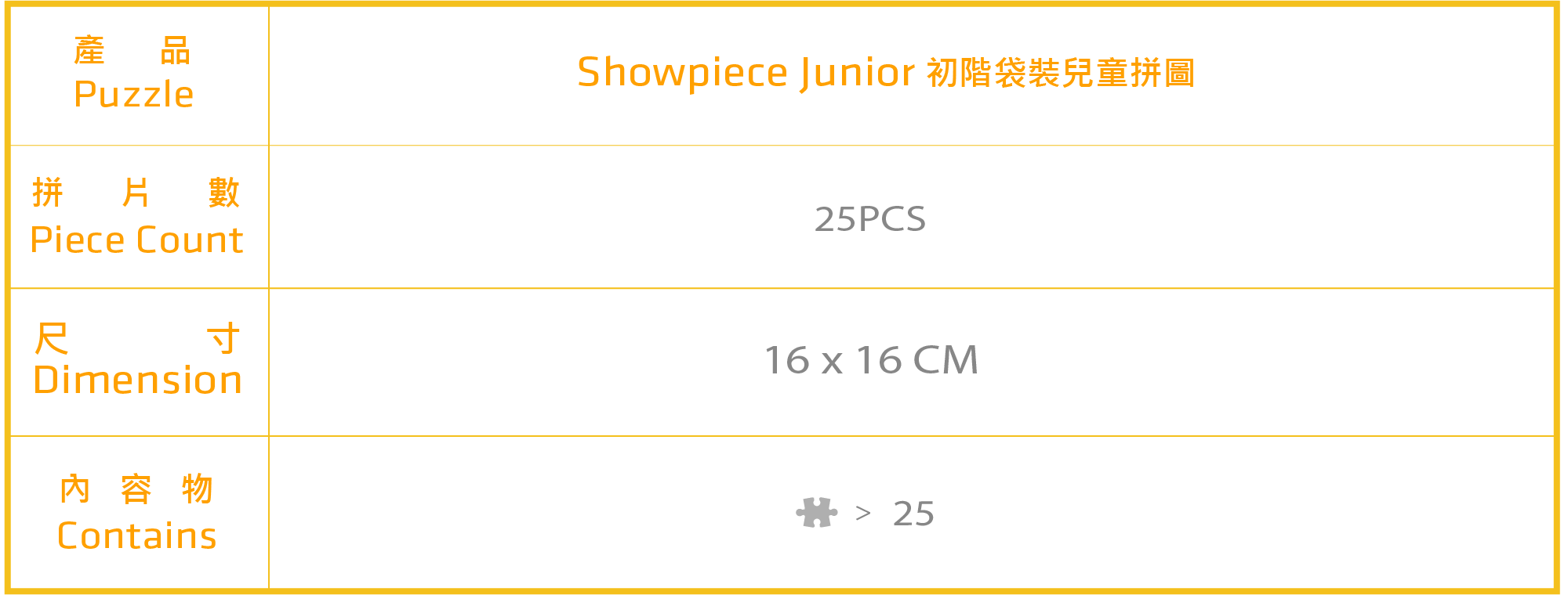 25 片 袋 裝 兒 童 拼 圖 內 附 模 型 紙 並 採 收 納 袋 包 裝 設 計, 外 出 在 家 都 可 玩 。