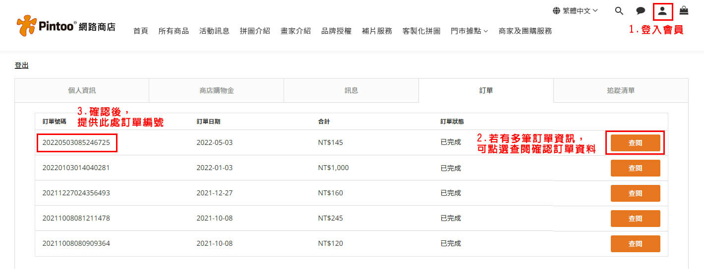 ※註1:訂單編號可以至Pintoo官網登入會員帳號後,至「訂單」頁面找到有購買「T1083 - 造型兒拼114片 - 童話故事系列 - 三隻小豬故事」的訂單紀錄,左側即為訂單編號。